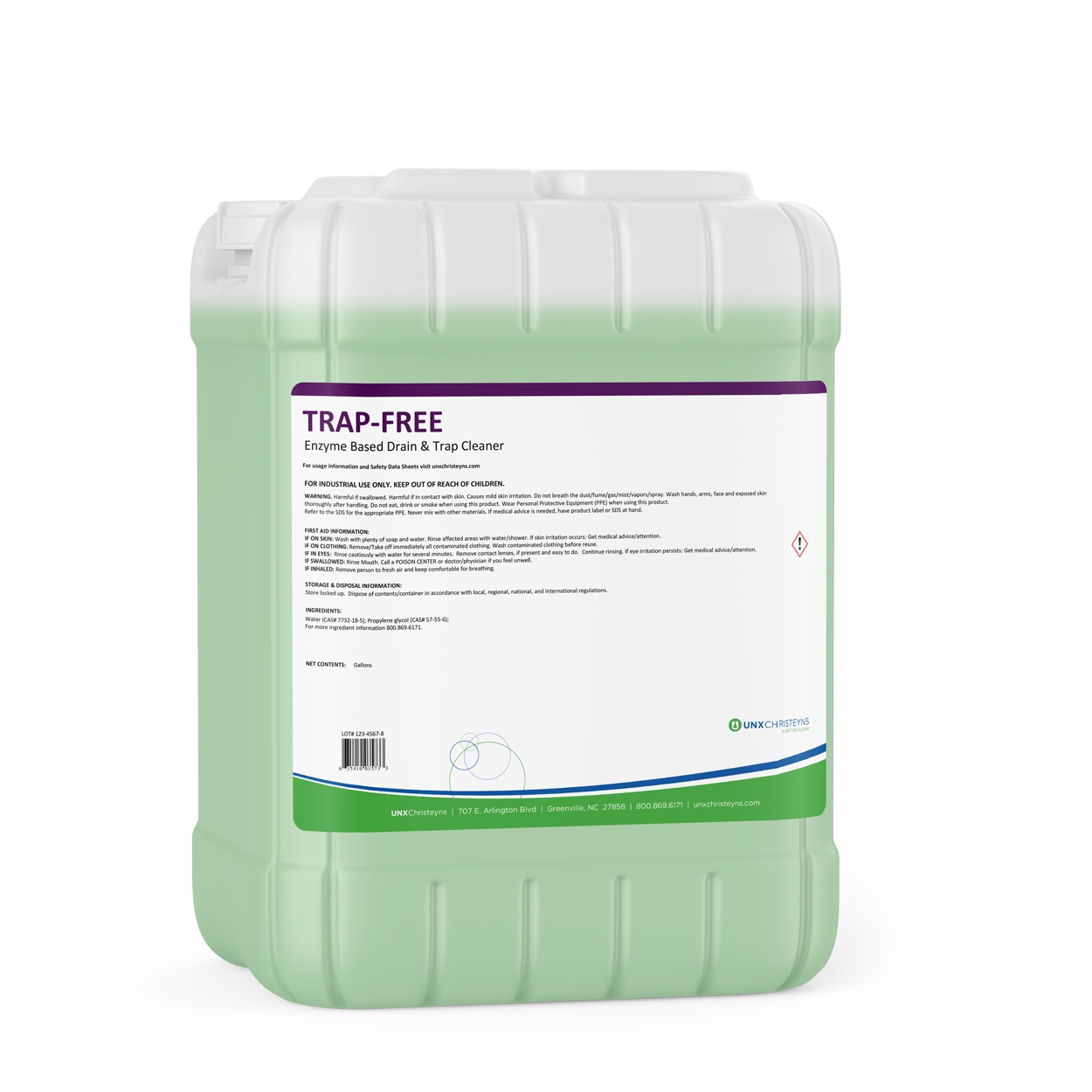 Keep your commercial kitchen running smoothly with Trap-Free, the ultimate solution for maintaining clean, clog-free drains and grease traps. Trap-Free’s professional strength formula works to prevent blockages and eliminate odors. With powerful enzymes that break down fats, proteins, starches, cellulose and more, Trap-Free keeps your drains flowing freely. Say goodbye to unexpected plumbing issues and hello to peace of mind with Trap-Free.